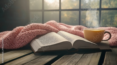 Open book, warm drink, cozy knit blanket, wooden surface.