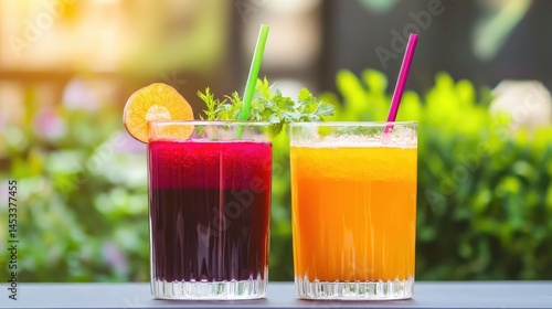 Beetroot and carrot juice duo in clear cups with eco-friendly straws, shot outdoors on sunny patio table