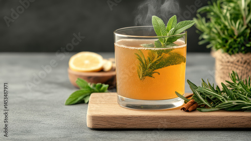 Refreshing herbal drink with mint and rosemary, garnished with lemon slices