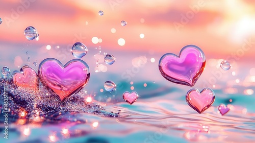 Peaceful pastel ocean with delicate heart-shaped bubbles glowing faintly, creating a magical and serene floating scene