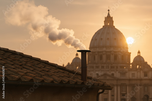 White smoke rises from the chapel chimney at sunset, signaling the election of a new pope during the papal conclave.