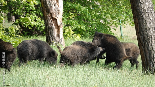Stado dzików na wolności, na przedmieściach dużego miasta