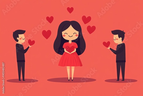 emoji dating concept, suitors sending hearts toward center emoji girl, vector