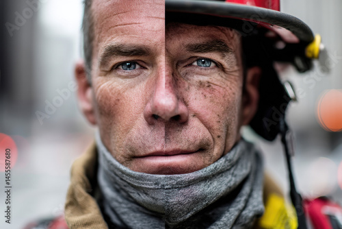 Close-up of a firefighter with one half in uniform and the other in casual wear, symbolizing dual roles, gritty urban background