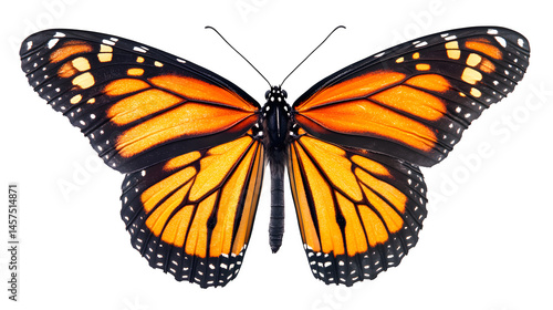 A detailed close-up of a vibrant monarch butterfly with orange and black wings, isolated on white background