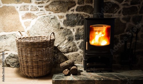 The interior of a cosy, stone cottage with stone walls and a fireplace with logs burning in a wood burner on a fireplace and hearth.