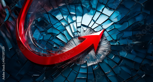 A vibrant red arrow curves through a shattered, dark-blue glass surface, suggesting overcoming adversity and rising above challenges. The arrow symbolizes resilience and progress.