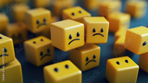 Customer pain points analysis concept with yellow cubes showing sad faces, representing dissatisfaction in financial product services, aimed at product improvement and development, business, research