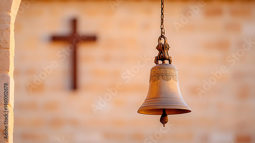 Church Bell: A classic, ornate church bell hangs suspended, with a cross in the background, evoking traditional architecture and spiritual heritage.