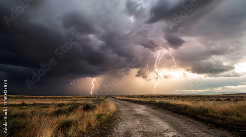 Dramatic thunderstorm over a rural dirt road with lightning illuminating dark clouds