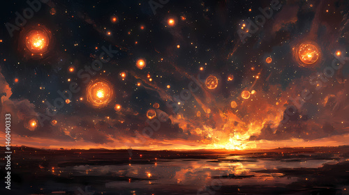 The eternal fireflies. [Solar Echoes] | Infinite Dawn | endless glow. Illustration