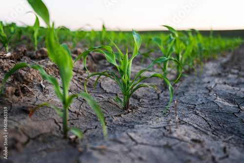 Close-up of single corn sprout emerging from dry cracked farmland soil