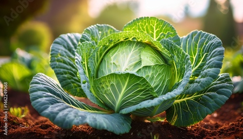 a close up of a fresh cabbage growing amid fertile soil in a vibrant garden showcasing the intricate pattern of its ruffled green leaves