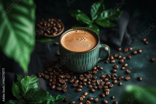 Zielony kubek z kawą otoczony ziarnami kawy i zielonymi liśćmi na ciemnym tle. Kubek ma brązowe paski, a kawa jest kremowa z bąbelkami na powierzchni.