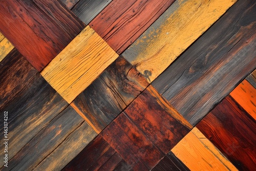 A patterned background featuring wooden planks of various colors arranged in diagonal and perpendicular directions forming a herringbone design.