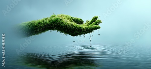 A mossy hand gently releases water droplets into calm water, symbolizing nature's delicate balance and the importance of environmental conservation.
