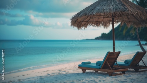 Beach scene for summer holiday travel featuring tropical island luxury resort hotel, sun umbrella, and chairs on the beach.
