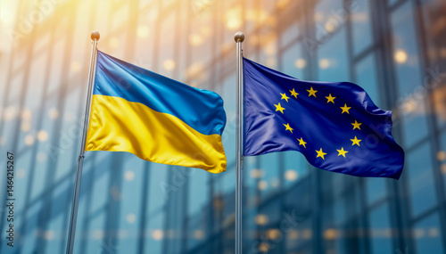A hyperrealistic uplifting scene featuring the european union and ukrainian flags waving together in front of a modern glass building