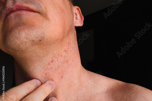Skin irritation after shaving. Skin irritation on male neck after shaving. Close-up photo.