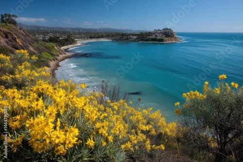 Vibrant Yellow Blossoms Overlooking Strand Beach from Dana Point Headlands, California's Stunning Coastal Paradise
