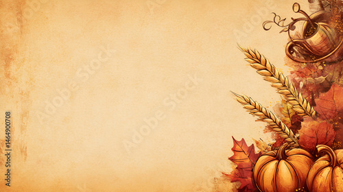 Thanksgiving Harvest Concept Background with Pumpkin, Wheat Ears, Pine Cones, and Abundant Food Colors for PPT Presentations, Expressing Gratitude and Bounty.