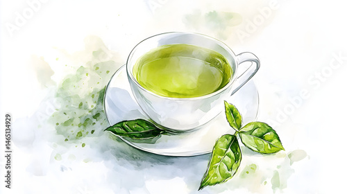Watercolor Illustration of green tea. Watercolor illustration of non-alcoholic drinks on white background.