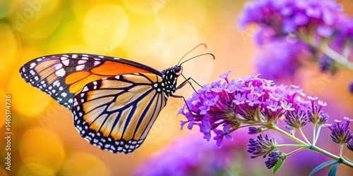 A delicate monarch butterfly sipping nectar from a vibrant purple flower with intricate details and soft focus background , monarch, floral