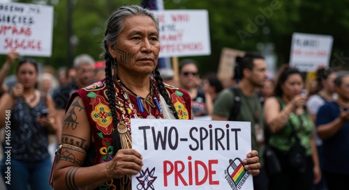 Middle-aged Indigenous person with facial tattoos and traditional clothing holds a "TWO-SPIRIT PRIDE" sign during a protest or march.