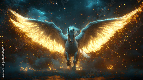 Pegasus winged legendary horse flying with spread wings on dreamy landscape