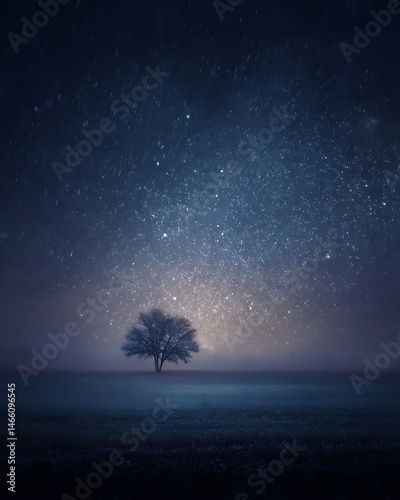 Under a cascade of stars, the lone tree stands — a witness to time, wishes, and enduring solitude.
