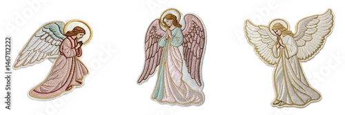 Set of A embroidered patch badge angel isolated on a transparent background.