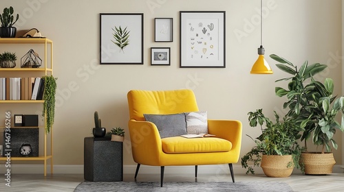 Cozy yellow armchair in a modern living room with plants and framed artwork.