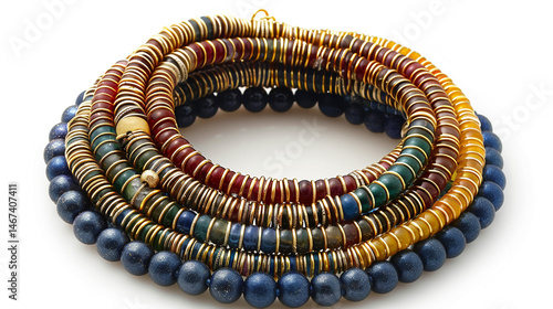 A broad collar necklace with alternating rows of colored beads and gold spacers, representing status and wealth, isolated on white.