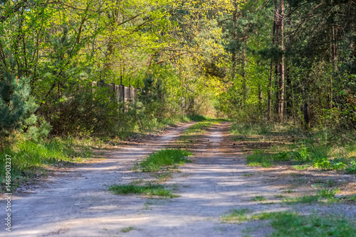Droga gruntowa wczesną wiosną w słoneczny dzień. Wąska droga gruntowa otoczona wysokimi drzewami w bujnym otoczeniu lasu. Młode zielone liście sugerują wczesną wiosnę. Kępy trawy wyłaniają się z drogi
