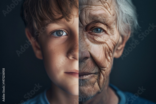 Face divided into two halves - one half of kid boy and half of old man. Childhood and old age. Getting older, aging, maturing, longevity, lifespan, senescence, gerontology, anti-aging concept