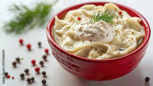 Traditional russian pelmeni dumplings in vibrant red bowl with sour cream