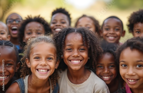 Joyful group of African American children smiling at camera. Diverse kids exhibit genuine happiness, friendship. Childhood portrait represents positive emotions, teamwork, community. Happy faces