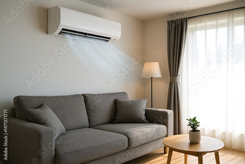 自然光の差し込む部屋でルームエアコンが冷風を送る快適な空間
