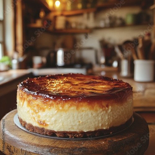 Delicious basque burnt cheesecake resting on wooden cake stand in rustic kitchen