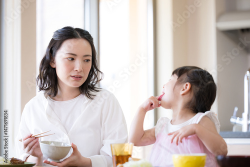 お行儀が悪いよ~と食事中のマナーを子ども注意する怒るお母さん 前を向いて食べてね~育児は大変