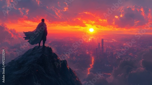 Silhouette figure on mountaintop, epic sunset over futuristic city