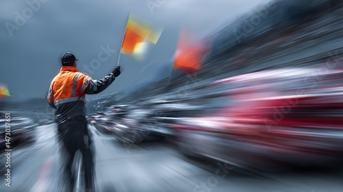 A race marshal waves the flags as the cars speed past on a racing circuit track.