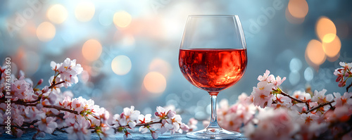 Glass of red wine with spring cherry blossom branches on blue textured background. Romantic wine tasting concept. Seasonal beverage for celebration or relaxation.