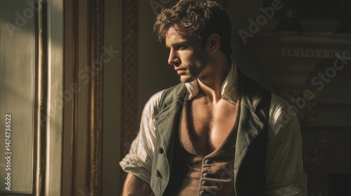 handsome regency-era man, tall and lean muscular build, cinematic lighting, high detail, romantic historical style, he wears a regency vest and coat
