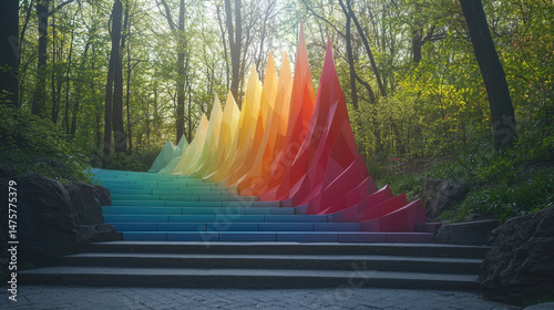 Colorful geometric art installation cascades down outdoor stone steps within a lush green park, creating a vibrant and captivating scene for passersby.