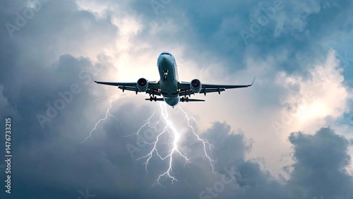 White passenger airplane flying through turbulent stormy clouds, surrounded by bright flashes of lightning, illustrating the challenges and dangers of flight during severe weather conditions