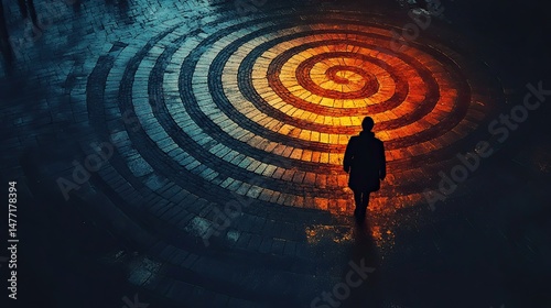 Silhouette of person walking on spiral brick pattern with blue and orange lighting at night time