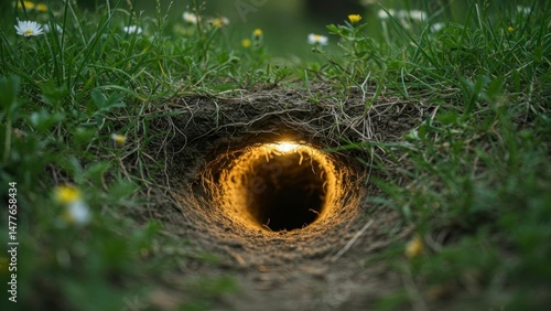 A mysterious rabbit hole in a field.