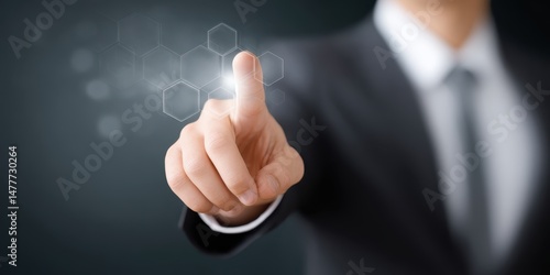 Close up of a hand in a suit interacting with a digital interface, shown as glowing hexagons. Dark background.