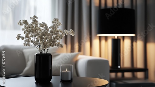 modern living room featuring stylish black lamp and vase of flowers on sleek table. elegant decor creates serene atmosphere, perfect for relaxation